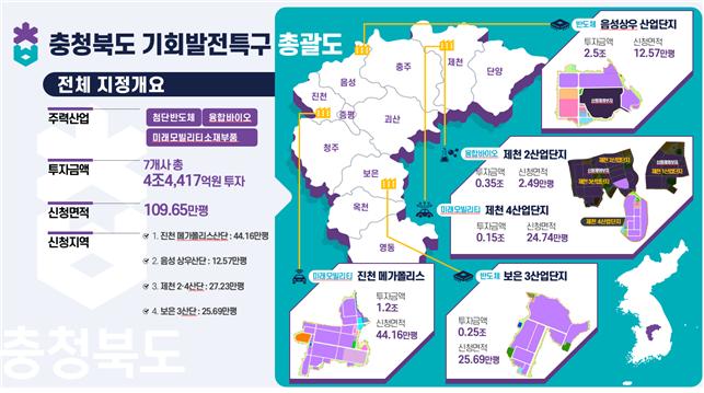 광역자치단체가 최대 신청할 수 있는 200만 평(661만1천570㎡) 중 54.8%를 차지한다. 지정된 지역은 제천시와 보은군, 진천군, 음성군이다.