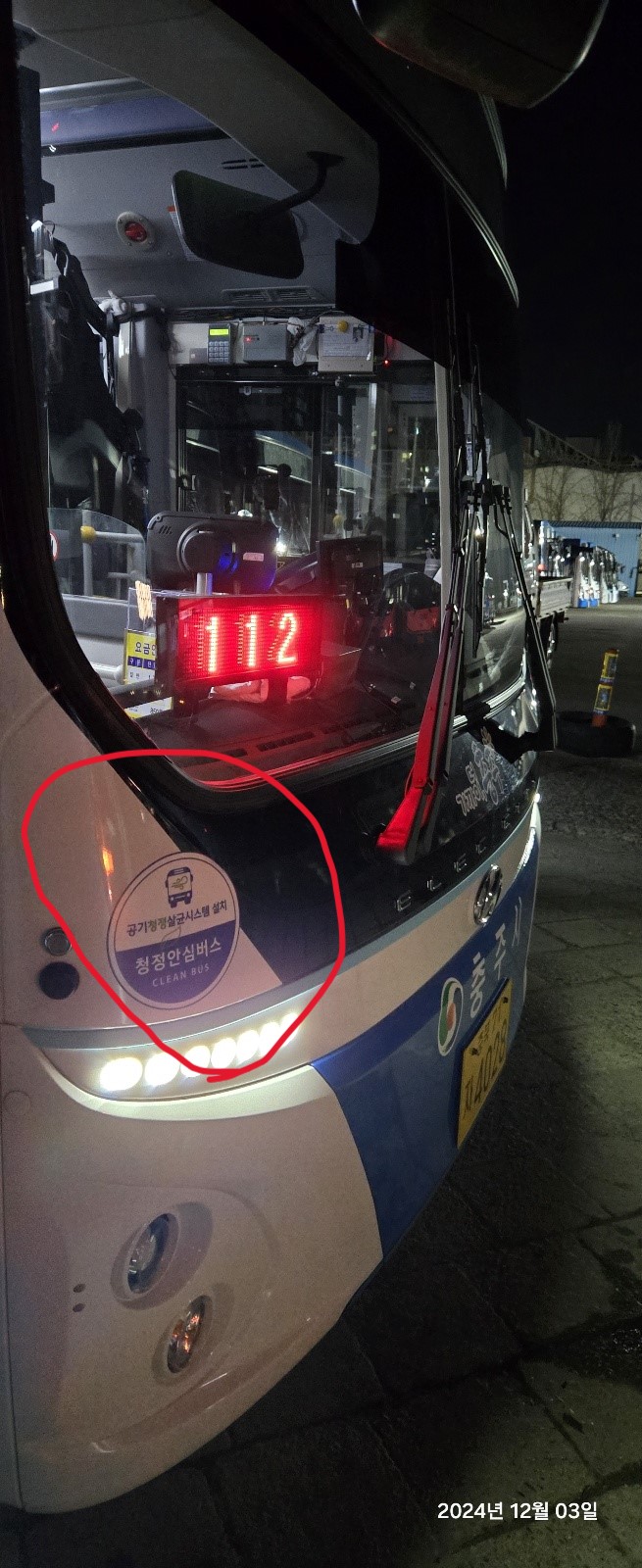 충주 친환경 저상버스에 공기청정기 스티커가 설치된 모습.