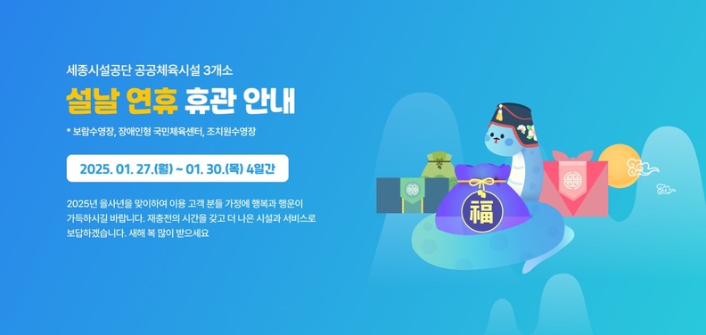 휴관 관련 내용은 공단 공식 홈페이지(www.sjfmc.or.kr)에서 확인할 수 있으며, 설 연휴가 끝나는 오는 31일부터 정상 운영된다.