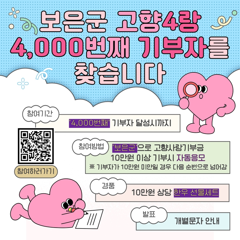 [충북일보] 보은군이 고향사랑기부제 참여확대와 지역경제 활성화를 위해 '보은군 고향4랑 4천 번째 기부자 이벤트'를 진행한다.