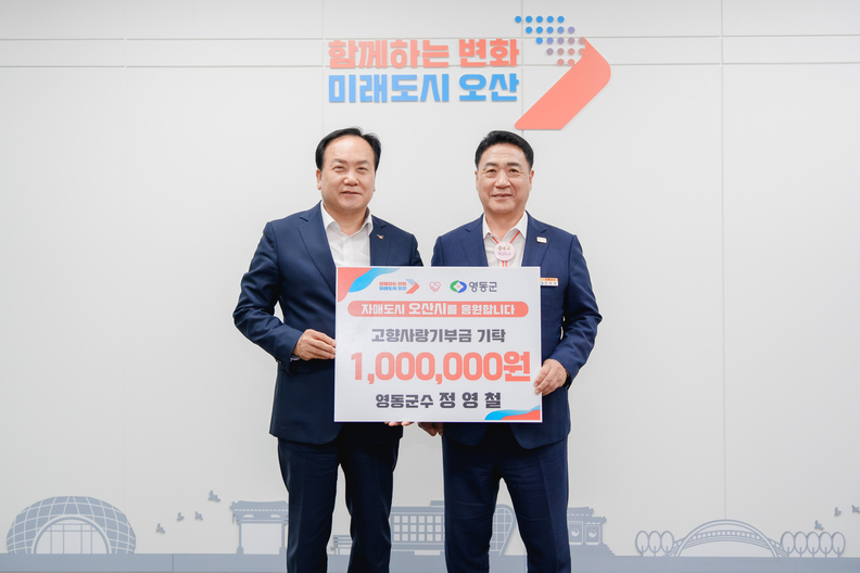 정영철 영동군수가 지난 14일 자매도시 경기도 오산시청을 방문해 고향사랑기부금을 전달하고 있다.