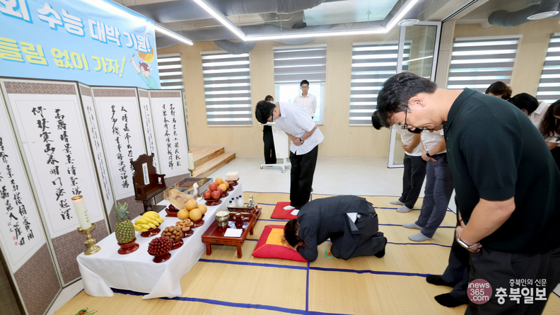 2026학년도 대학수학능력시험을 100일 앞둔 5일 청주 운호고등학교에서 희망하는 3학년 수험생과 교직원, 학부모들이 돼지머리와 과일 등 푸짐하게 차려진 고사상에 절을 하며 수능 고득점을 기원하고 있다.