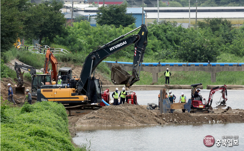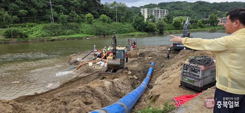 증평읍 사곡리 보강천 송수관로 누수현장에서는 긴급 복구작업이 한창이다.