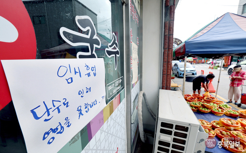 충북 증평군 증평읍 일원의 송수관로 누수에 따른 단수 사태가 이틀째 이어진 6일 신동리 장뜰시장 인근의 한 식당에 '단수로 임시 휴업'한다는 안내문이 부착돼 있다.