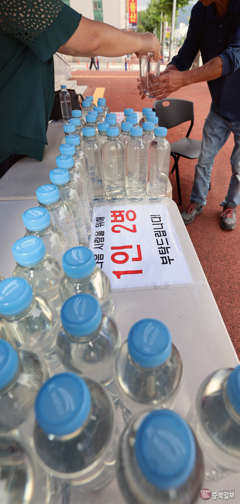 충북 증평군 증평읍 일원의 송수관로 누수에 따른 단수 사태가 이틀째 이어진 6일 군청 관계자들이 버스정류장 인근 등 읍내 곳곳에 임시 생수 배부처를 설치하고 1인당 2병의 생수를 지급하고 있다.