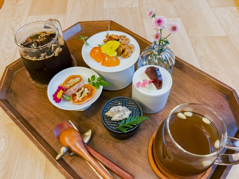 카페 내부에는 은은한 조명과 우드톤 가구들이 어우러져 더욱 아늑하고 전통적인 분위기를 느낄 수 있다. 특히 창가 자리에 앉아 따뜻한 햇살을 맞으며 여유를 만끽하다 보면, 마치 도심 속 한방 숲에 와 있는 듯한 기분이다.