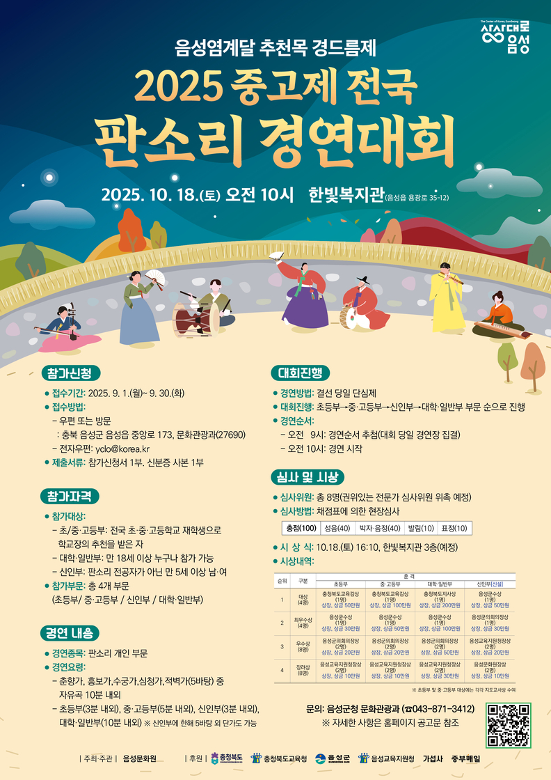 [충북일보] 음성군은 '염계달 추천목 경드름제 2025 중고제 전국 판소리 경연대회를 오는 10월 18일 음성읍 한빛복지관에서 연다.