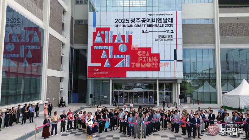 [충북일보] 4일 청주문화제조창 본관 앞 광장에서 열린 2025 청주공예비엔날레 개장식에서 이범석 청주시장을 비롯한 세계 각국에서 온 작가 등이 참여해 개장 퍼포먼스를 하고 있다. '세상짓기'란 주제로 청주문화제조창 일원에서 열리는 이번 공예비엔날레는 오는 11월 2일까지 본전시와 초대전시 등 60일간 이어진다. / 김용수기자