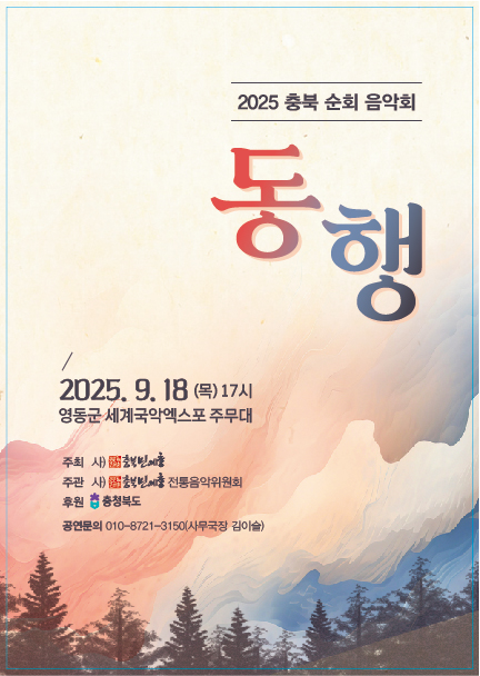[충북일보] (사)충북민예총 전통음악위원회가 오는 18일 오후 5시 영동세계국악엑스포 주무대에서 2025 충북순회음악회 '동행'를 개최한다.