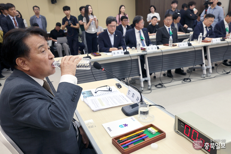 청주 오송 지하차도 참사 관련 국정조사를 벌이고 있는 국회 행정안전위원회가 15일 오전 충북도청을 방문해 도지사에게 지하차도 현장 조사와 관련된 질의응답을 실시했다. 이날 충북도의회 다목적회의실에서 열린 국정조사에서 김영환 지사가 답변을 마친 후 생수를 병째 들이키고 있다.