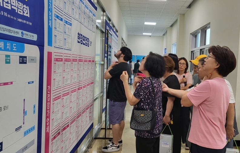 증평지역 구직자들이 지난 16일 증평 34플러스센터에서 열린 '일자리 이음 취업박람회'에 참가해 기업들의 구직현황을 살펴보고 있다.