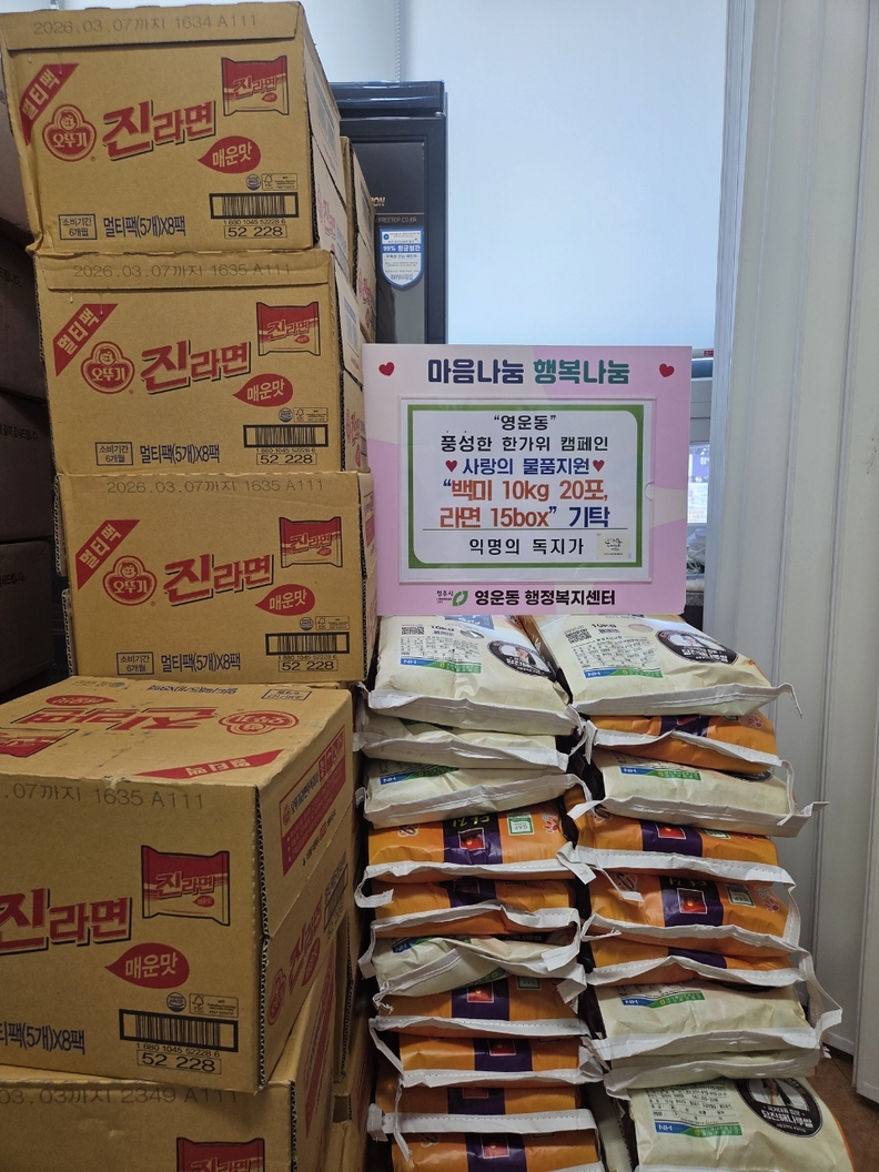 [충북일보] 청주시 영운동 행정복지센터는 익명의 독지가가 백미 10kg 20포, 라면 15박스를 기탁했다고 23일 밝혔다.