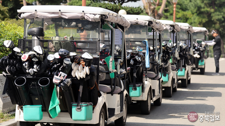 29일 청주시 청원구 오창읍 그랜드CC에서 충북일보와 충북리더스클럽이 주최한 15회 충북경제단체 친선 골프대회에서 대회 참가자들이 타고 이동할 카트가 순서를 기다리고 있다.