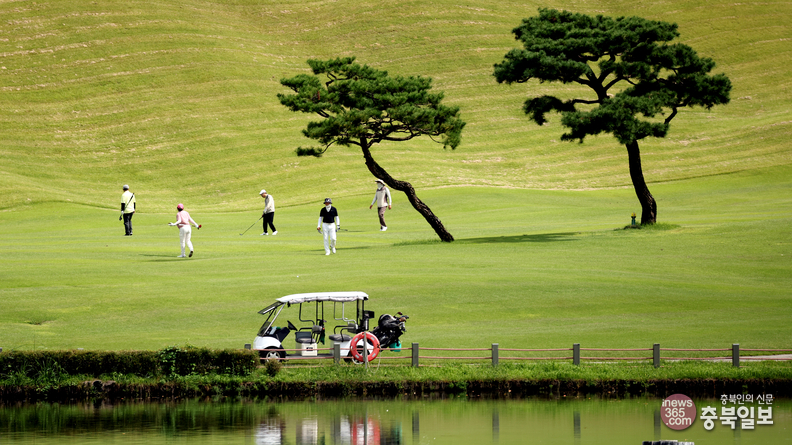 충북일보와 충북리더스클럽이 주최한 15회 충북경제단체 친선 골프대회가 29일 청주시 청원구 오창읍 그랜드CC에서 열렸다. 대회 참가자들이 가을 날씨 속에 그린에서 라운딩을 즐기고 있다.