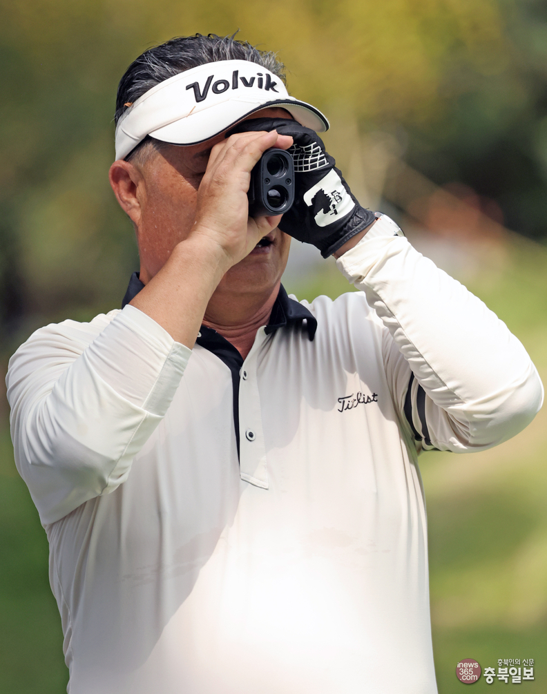 29일 청주시 청원구 오창읍 그랜드CC에서 충북일보와 충북리더스클럽이 주최한 15회 충북경제단체 친선 골프대회에서 한 대회 참가자가 거리를 측정하고 있다.