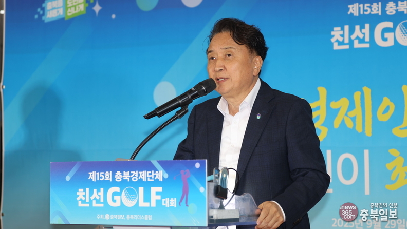 29일 청주시 청원구 오창읍 그랜드CC에서 충북일보와 충북리더스클럽이 주최한 15회 충북경제단체 친선 골프대회 시상식에서 김영환 도지사가 축사를 하고 있다.