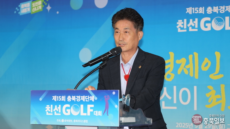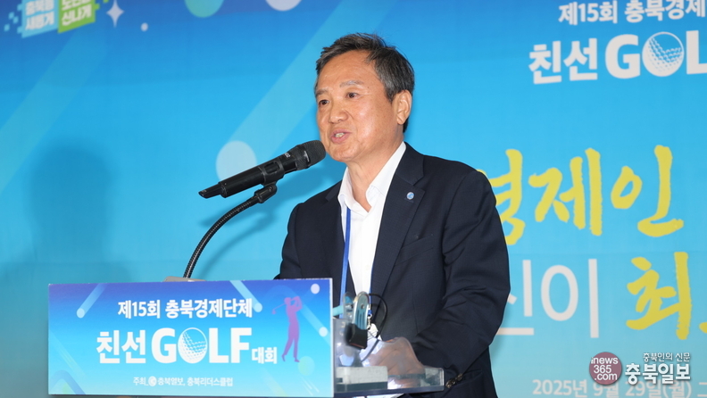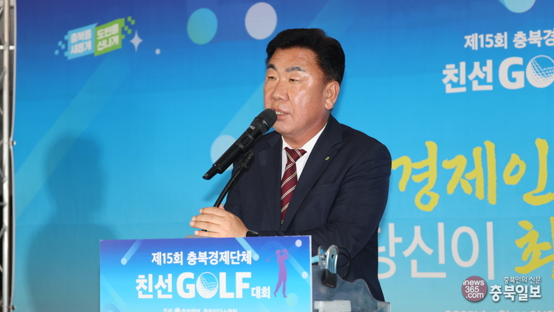 29일 청주시 청원구 오창읍 그랜드CC에서 충북일보와 충북리더스클럽이 주최한 15회 충북경제단체 친선 골프대회 시상식에서 연경환 충북일보 대표이사가 대회사를 하고 있다.
