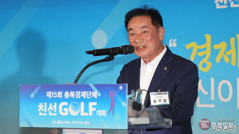 29일 청주시 청원구 오창읍 그랜드CC에서 충북일보와 충북리더스클럽이 주최한 15회 충북경제단체 친선 골프대회 시상식에서 송기섭 진천군수가 축사를 하고 있다.