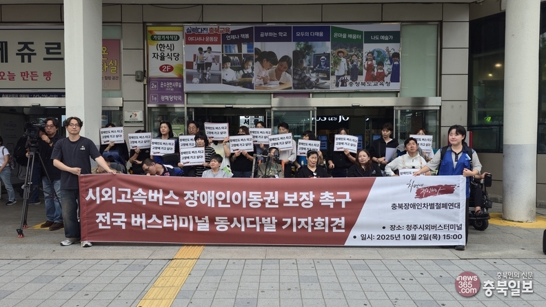 충북장애인차별철폐연대는 추석을 앞둔 2일 청주시외버스터미널 앞에서 기자회견을 열고 "장애인도 시외고속버스 타고 고향에 가고 싶다"며 "자유롭게 이동할 수 있는 권리를 보장하라"고 촉구했다.
