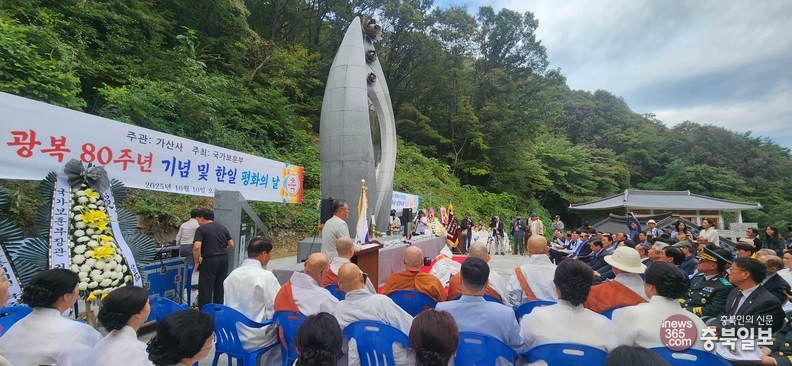 10일 충북 옥천군 안내면 가산사 호국충혼탑 앞에서 열린 ‘광복 80주년 기념 및 한일 평화의 날’ 행사 전경. 국가보훈부와 가산사가 공동 주관한 이번 행사에는 불교계와 보훈처 관계자, 지역 인사들이 대거 참석했다.