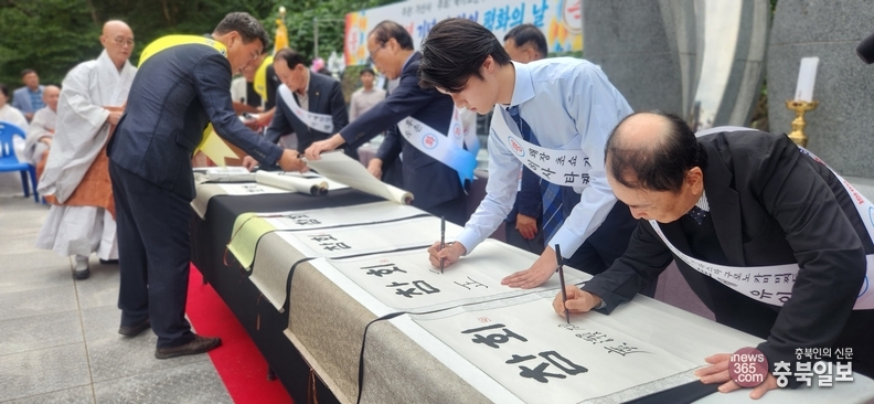 행사의 마지막은 한일 양국의 평화를 기원하는 퍼포먼스로 마무리됐다. '참회(懺悔)', '화해(和解)', '평화(平和)' 세 글씨가 적힌 족자를 제작해 왜장 후손과 피해자 후손, 국가보훈부 대표가 한 점씩 나누어 들었다.