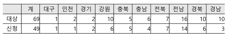 농림축산식품부에 따르면 지난 9월 29일부터 10월 13일까지 진행된 농어촌 기본소득 시범사업 공모 결과, 인구감소지역으로 지정된 69개 군 가운데 49개 군(71%)이 참여 의사를 밝혔다. 선정 규모(6개 군 내외)에 비해 경쟁률은 약 8.2대 1에 달한다.