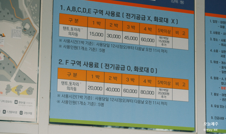 A~E 구역은 1박에 1만5천원이지만 일요일부터 목요일까지는 30%를 영동사랑상품권으로 환급해주기 때문에 하루 숙박비용의 부담이 가볍다.
