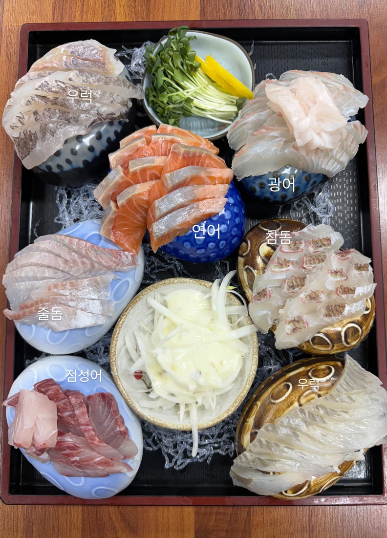 원규씨의 취향에 맞춰 자연산으로 가져오는 장어회(아나고회)도 알고 찾아오는 이들의 단골메뉴다. 놀래미, 광어, 우럭 등과 함께 먹을 수 있는 세트 구성도 자연산 활어회를 알짜배기로 즐기는 방법이다. 오후에 손질해 1~2시간 숙성하는 광어회의 적당한 찰기와 바로 잡아 내는 우럭의 탱글한 식감이 신선함을 전한다.