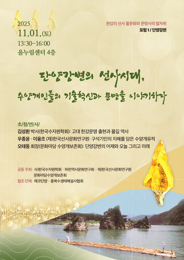 오는 11월 1일 오후 1시30분부터 4시까지 단양 올누림센터 4층에서 '한강의 선사 물문화와 문명사의 발자취' 심포지엄이 개최될 예정이다.