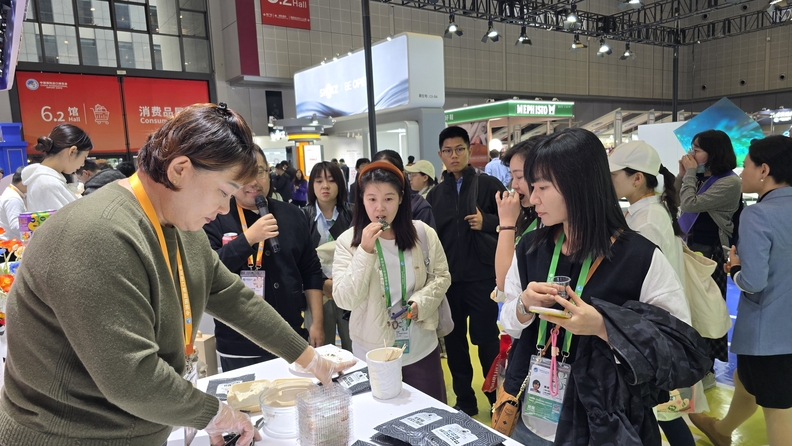 8회 중국 국제수입박람회(CIIE2025)에서 박향희 농업회사법인(주)한백식품 대표가 시식행사를 하고 있다.