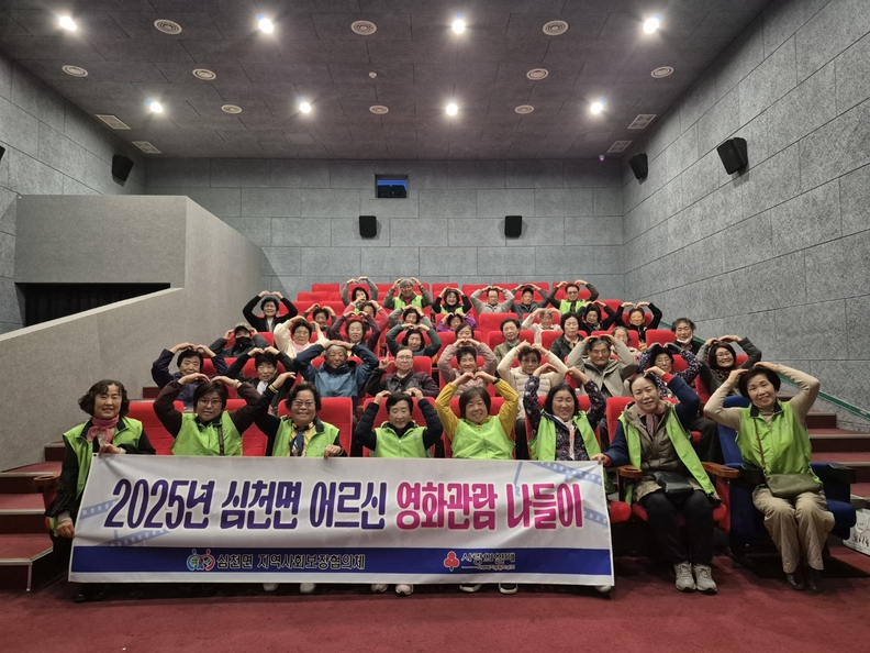 한편, 심천면 지역사회보장협의체(위원장 박현숙)는 문화생활 기회가 적은 어르신들을 위해 11일 '장수상회' 영화관람 나들이를 진행했다. 독거노인과 취약계층 어르신 30여 명이 참여했으며, 전세버스로 이동해 영화 관람과 점심식사를 함께하며 즐거운 시간을 보냈다.