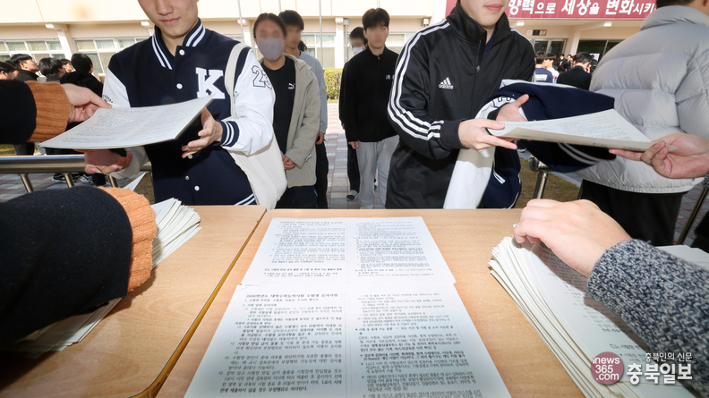 2026학년도 대학수학능력시험을 하루 앞둔 12일 전국 각 수능 시험장에서 예비소집이 열렸다. 이날 오후 청주 세광고등학교에서 수험생들이 유의사항이 적힌 유인물을 받아보고 있다.