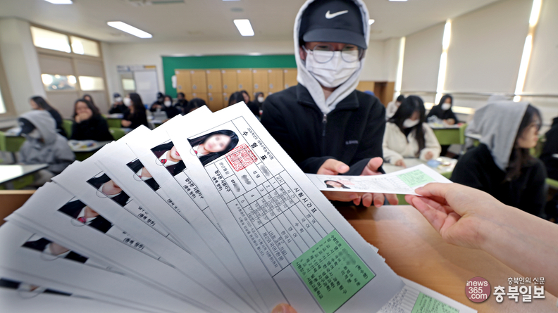 2026학년도 대학수학능력시험을 하루 앞둔 12일 오전 청주 일신여자고등학교에서 수험생들이 수험표를 받고 있다.