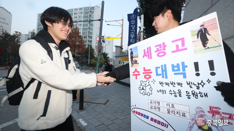 [충북일보]2026학년도 대학수학능력시험일인 13일 이른 아침부터 청주 주성고등학교 시험장에서 세광고등학교 선생님들이 격문을 들고 수험생들에게 '수능 대박' 응원을 보내고 있다. / 김용수기자