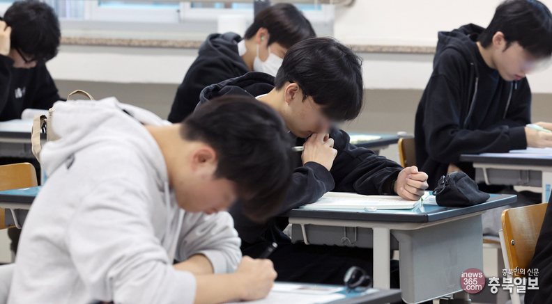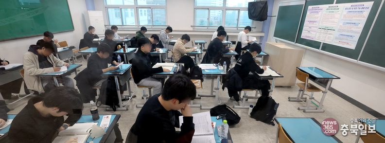 [충북일보]2026학년도 대학수학능력시험일인 13일 청주 주성고등학교 수능 시험장에서 수험생들이 마지막 점검을 하며 시험 준비를 하고 있다. / 김용수기자