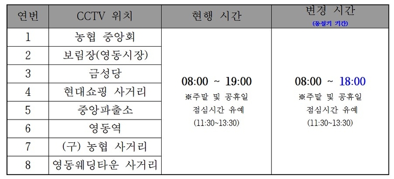 이번 조치는 영동읍 내 불법 주정차 단속용 CCTV 8개소로, △농협중앙회 △보림장(영동시장) △금성당 △현대쇼핑사거리 △중앙파출소 △영동역 △구 농협사거리 △영동웨딩타운 사거리에 적용된다.