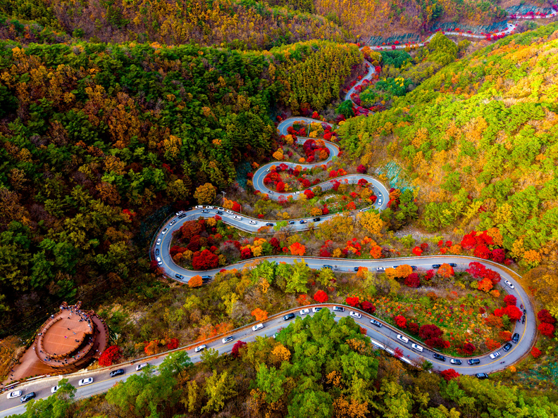 굽이굽이 이어지는 고갯길을 따라 붉게 물든 단풍 터널이 펼쳐지고 창문을 열면 싱그러운 낙엽 향기가 가을 정취를 더한다.