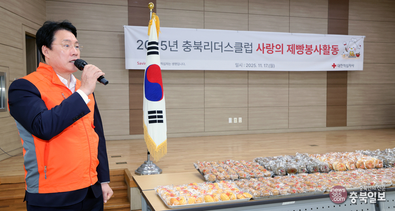충북리더스클럽 회원들이 17일 대한적십자사 충북지사 빵 나눔터에서 사랑의 제빵 봉사에 나섰다. 이날 전달식에서 이태희 충북리더스클럽 회장이 인사말을 하고 있다.