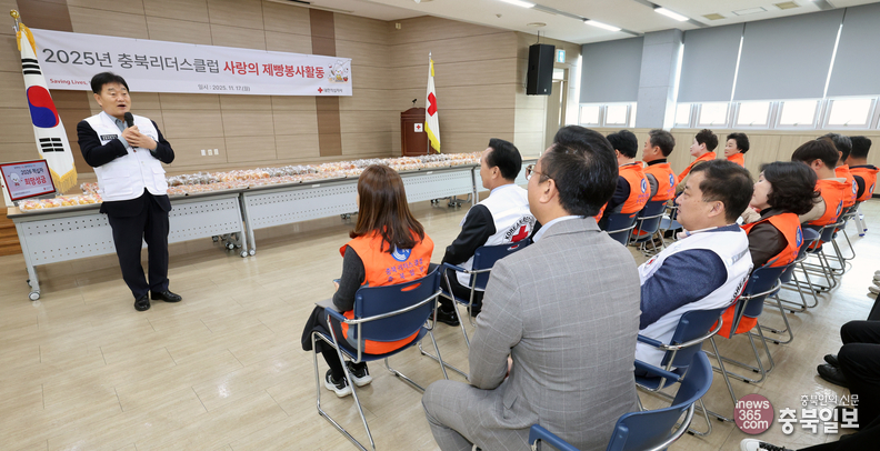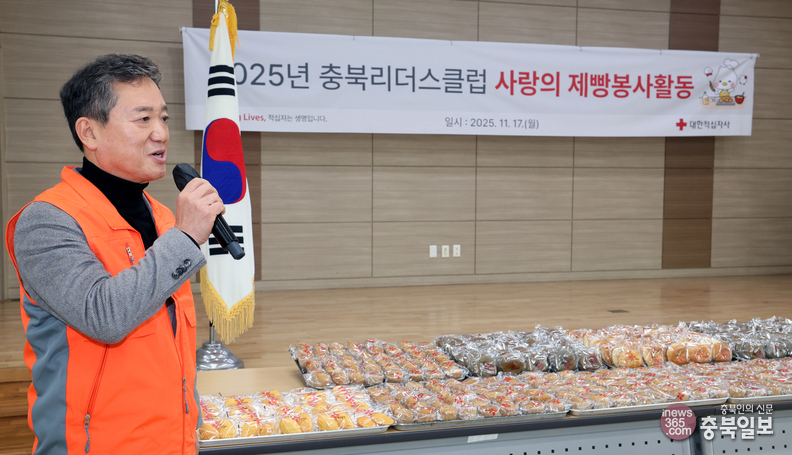 충북리더스클럽 회원들이 17일 대한적십자사 충북지사 빵 나눔터에서 사랑의 제빵 봉사에 나섰다. 이날 전달식에서 장현봉 충북적십자사 회장이 인사말을 하고 있다.