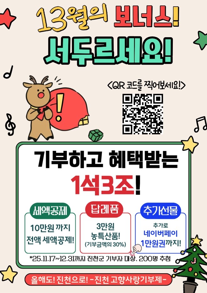 이벤트는 이 기간 진천군에 기부한 사람 중 200명을 추첨해 1만 원 상당의 네이버페이 상품권을 지급하는 방식으로 진행된다. 추첨과 결과는 내년 1월 중 발표된다.