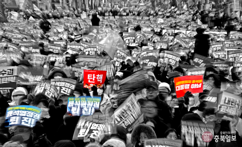 1년 전 비상계엄을 선포한 윤석열 전 대통령 탄핵·파면 후 이재명 정부가 출범했고, 윤 전 대통령과 관련자들은 내란 행위 등으로 재판 진행 중이다. 여·야의 정치적 갈등은 여전하다. 비상계엄 선포 1주년을 맞는 국민은 민주주의 수호의 의미와 국민주권의 가치를 다시 한번 되새기고 있다. 사진은 윤 전 대통령 탄핵소추안이 가결된 2024년 12월 14일 오후 청주시 상당구 충북도청 서문 앞에 모인 충북도민들 모습.
