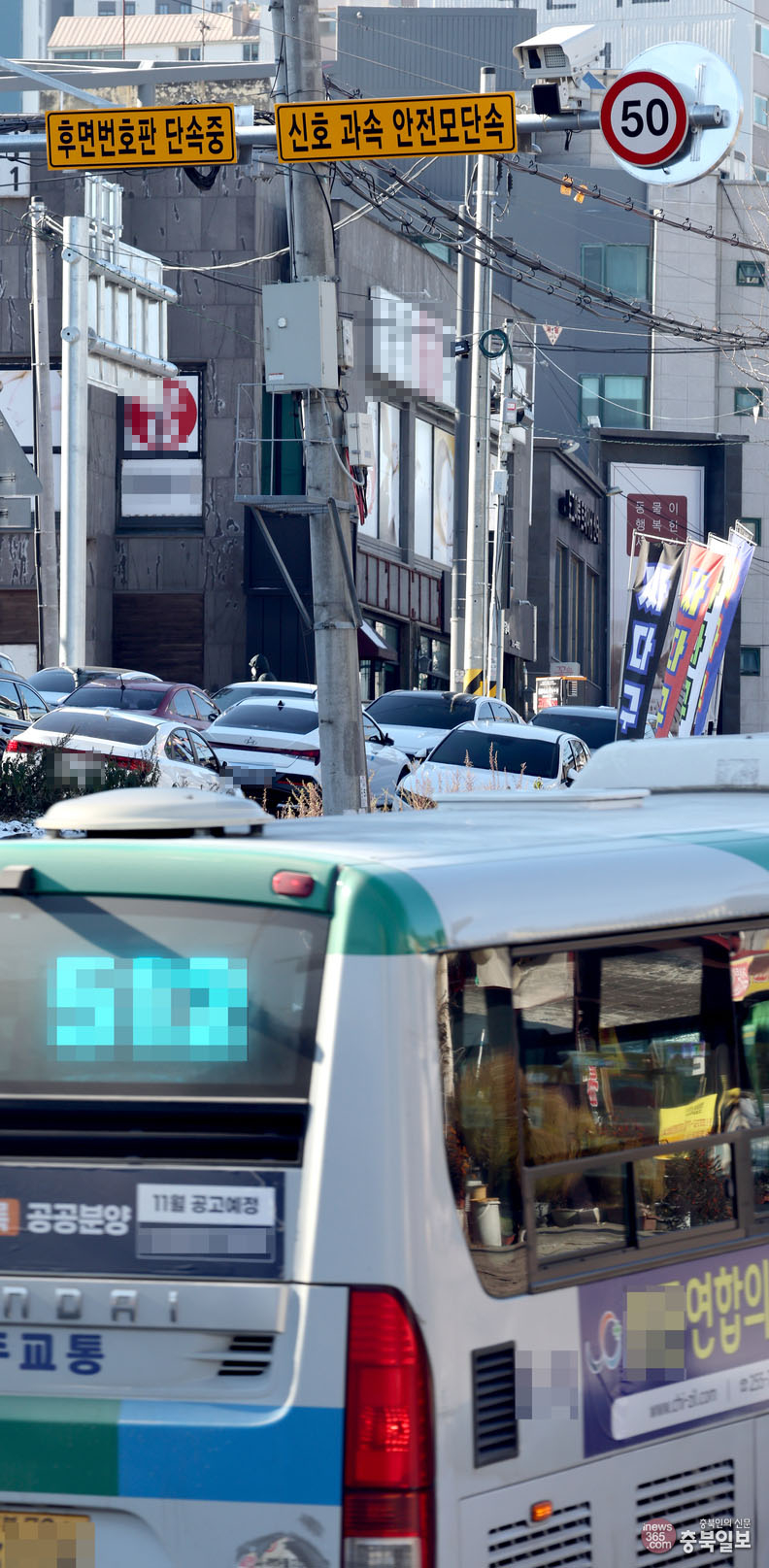 청주시 서원구 모충동 고개 삼거리에 설치된 후면번호판 단속카메라가 승용차와 이륜차 등의 과속과 신호 위반, 안전모 미착용 등의 교통법규 위반 행위를 단속하고 있다.