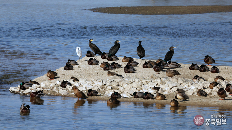 [충북일보] 대설을 지나 비교적 포근한 날씨를 보인 8일 오후 청주시 미호강 작천보 일원에서 텃새화된 가마우지와 쇠오리 등 철새들이 모래톱 위에 앉아 일광욕을 즐기듯 휴식을 취하고 있다. / 김용수기자