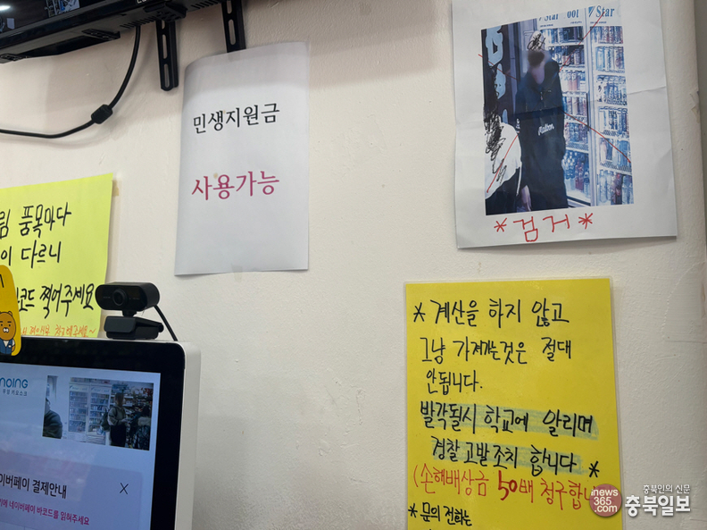 청주의 한 무인점포 점주가 절도범으로 추정되는 인물의 CCTV 화면 캡쳐본을 점포 내부에 게시하고 있다.