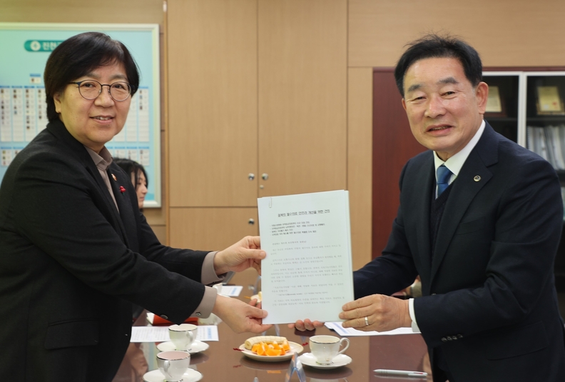 송기섭(오른쪽) 진천군수가 지난 12일 통합돌봄 시범사업 추진상황 확인차 진천군을 방문한 정은경 보건복지부장관에게 충북 필수의료시설 개선 건의문과 호소문을 전달하고 있다.
