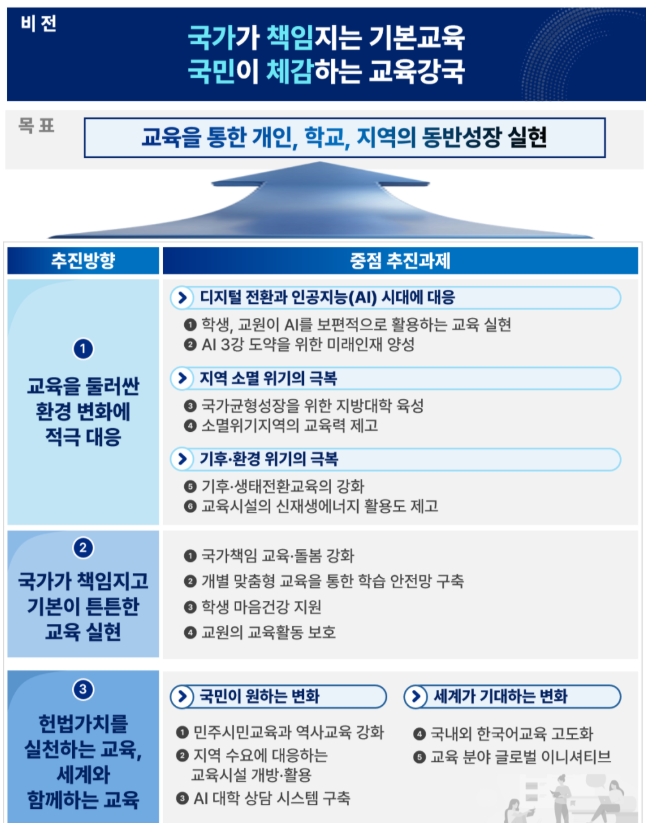 교육부는 △학생, 교원이 인공지능(AI)을 보편적으로 활용하는 교육 실현 △AI 3강 도약을 위한 미래인재 양성 △기후·생태전환교육 강화 △교육시설의 신재생에너지 활용도 제고 △학생 마음건강 지원 △교원의 교육활동 보호 △민주시민교육과 역사교육 강화 △AI를 활용한 대학 진학상담 고도화 △국내외 한국어교육 고도화 △교육 분야 글로벌 이니셔티브 등도 중점 추진과제로 발표했다.