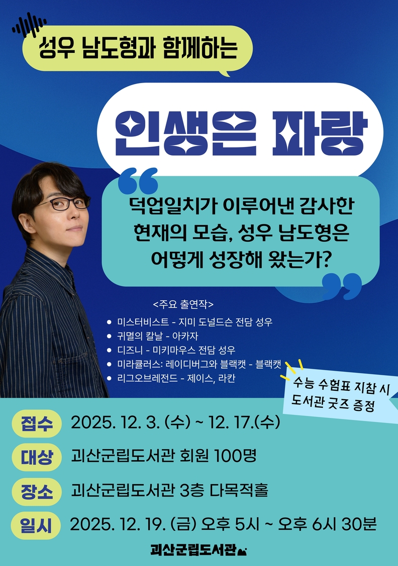괴산군립도서관, 연말 맞이 남도형 성우 초청 강연 안내.