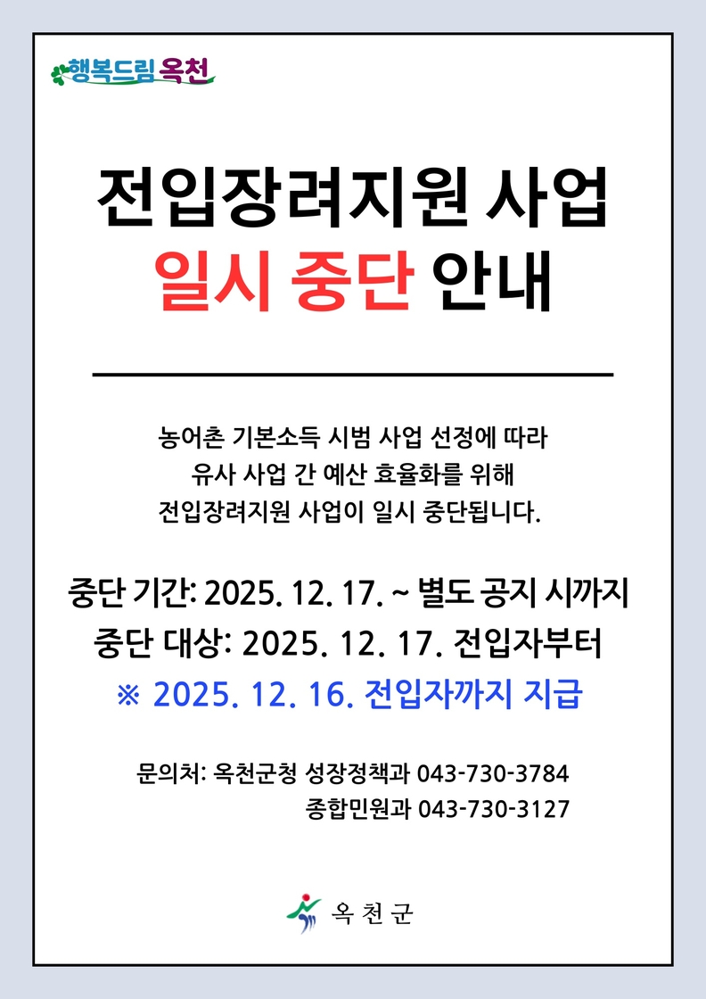 옥천군 종합민원과는 15일 군 홈페이지를 통해 "전입장려지원 사업을 12월 17일부터 별도 공지 시까지 중단한다"고 밝혔다. 중단 대상은 12월 17일 이후 전입자부터다.