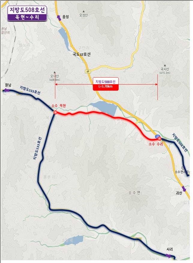 옥현~수리 도로개량공사는 2021년 충북도 도로건설관리계획에 지방도 508호선 승격과 함께 사업계획이 반영된 노선이다.