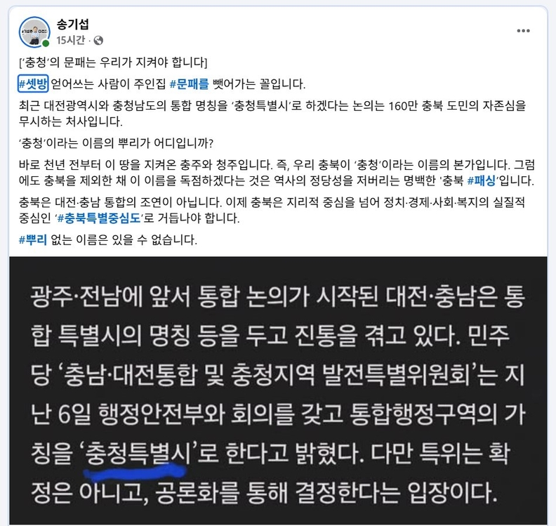 이어 "대전광역시와 충청남도의 통합명칭을 '충청특별시'로 하겠다는 최근 논의는 160만 충북도민의 자존심을 무시하는 처사"라며 "'충청'이라는 이름의 뿌리가 어디입니까?"라고 되물었다.